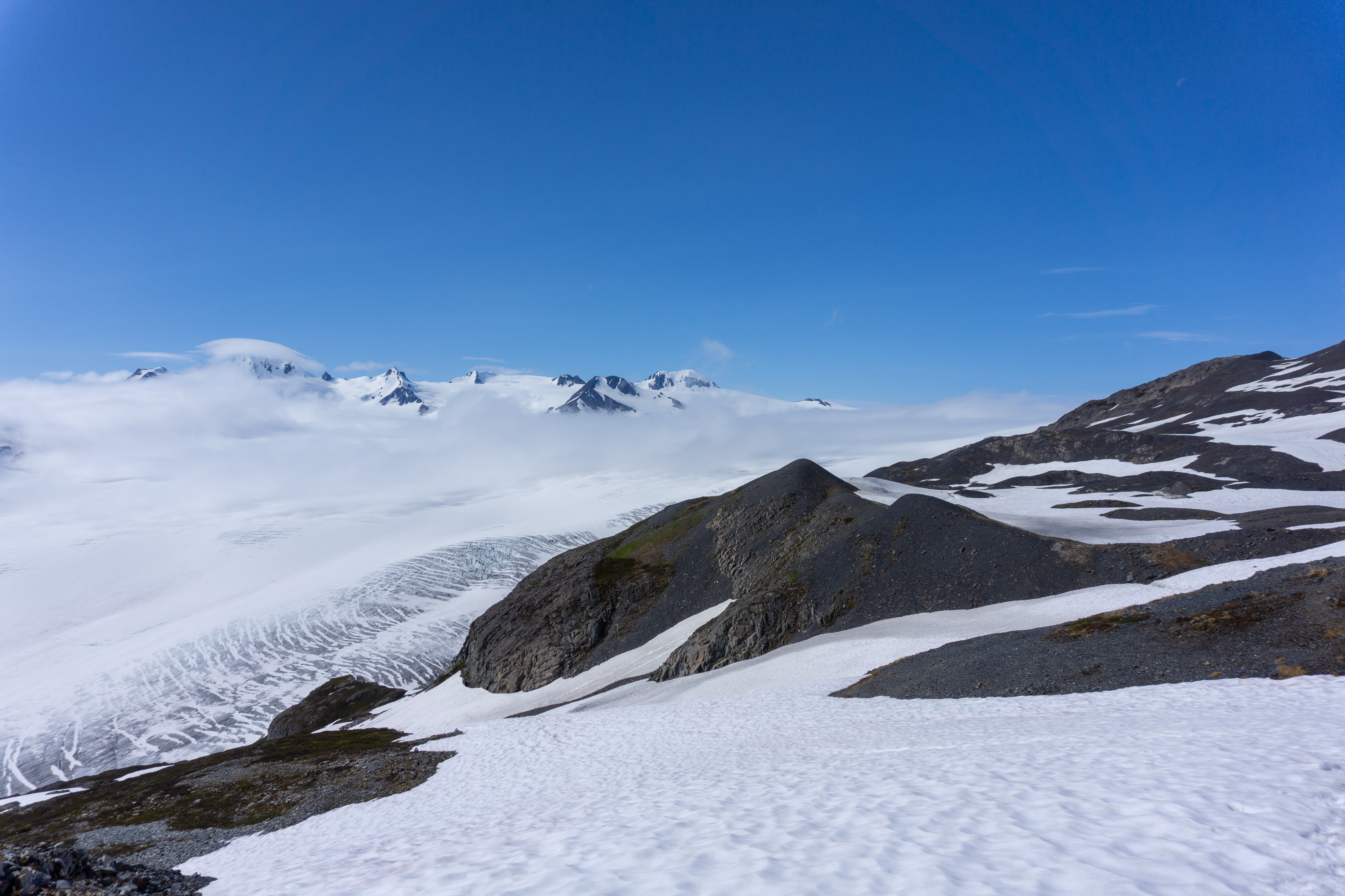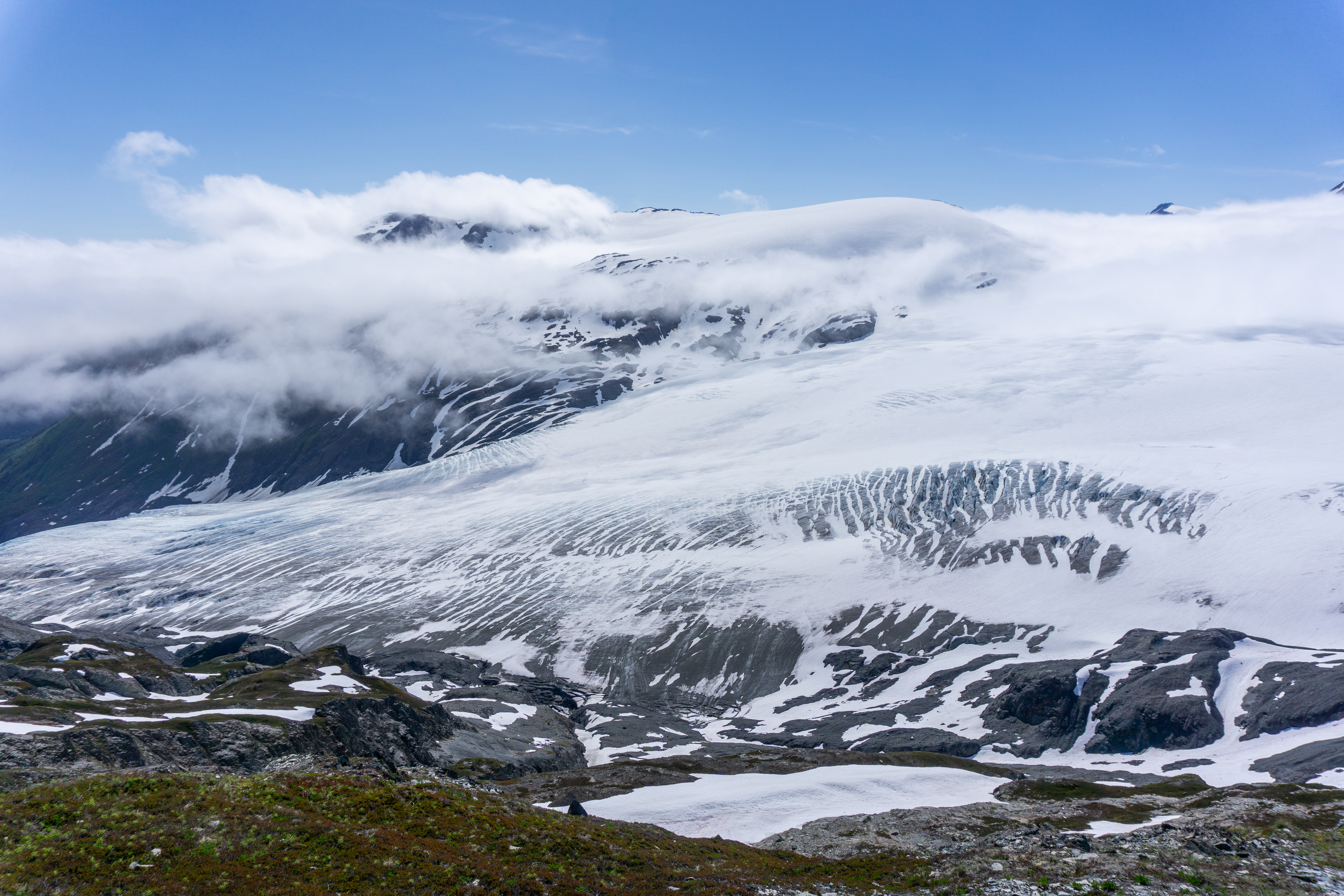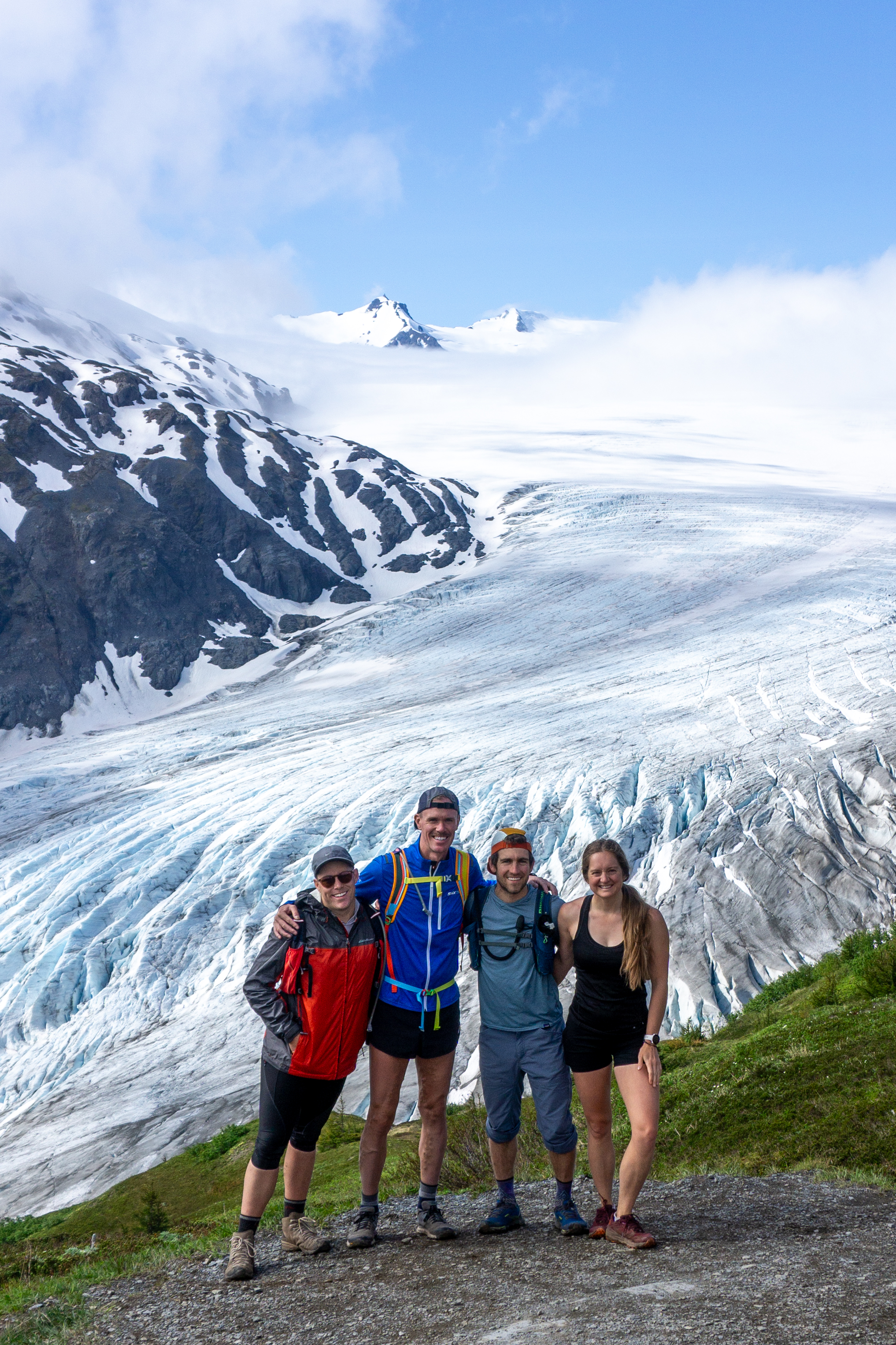 Our first day was planned to go visit Kenai Fjords National Park and hike up to the Harding Icefield via Exit Glacier (8.6 miles, 3,200’ gain). This hike has to go down as one of my favorites of all time. The hike was beautiful the entire way up, with a viewpoint at the “top of the cliffs” that left me speechless. There, you have a perfect view of Exit Glacier and a bit of the ice field above it. Exit Glacier is a quickly retreating glacier, and you can see how nature has been shaped by its presence all around in the plants that have since flourished to create a unique environment. When you reach the top of the hike, the landscape shifts to a remote almost lifeless mountaineous region. The ice field is massive and reaches beyond what our eyes could see — however, we could see little peaks popping up above the ice field. Worth the hike, 100%.